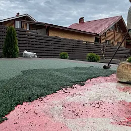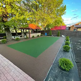 - материалы: Химтраст ПУ-Клей для резиновой крошки (1К), Химтраст Праймер-РК (1К), Резиновая крошка коричневая, Резиновая крошка изумруд;
